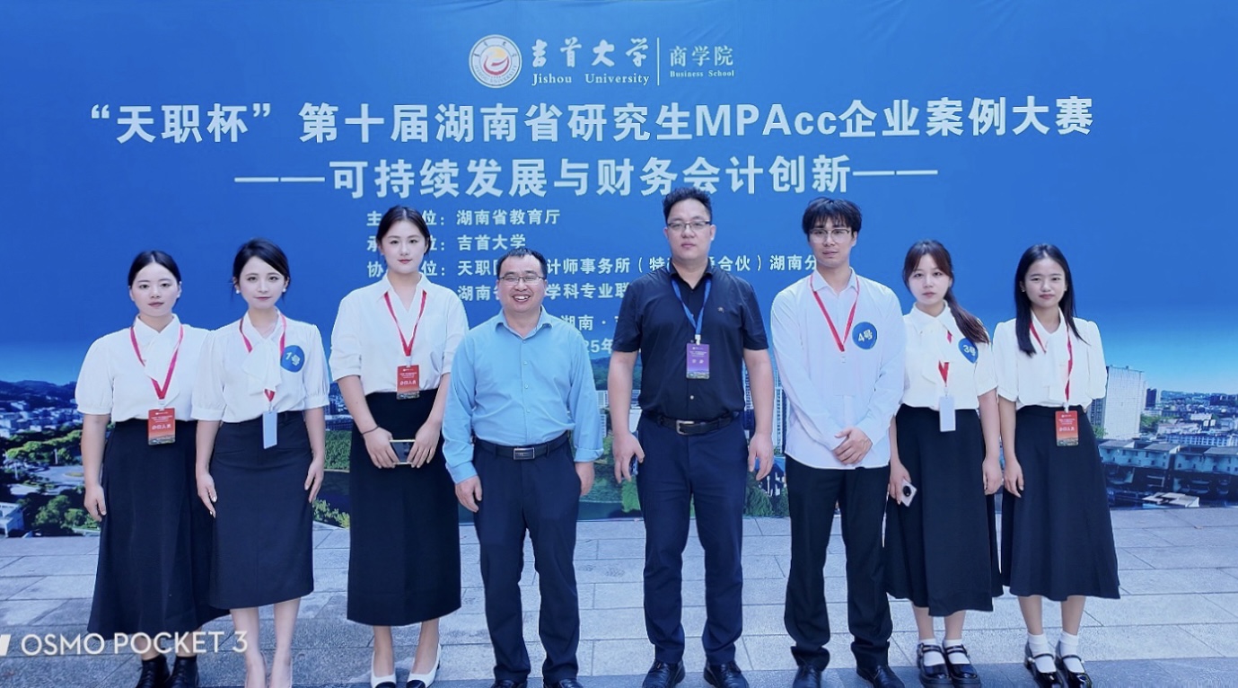 本网讯(通讯员 高芳香)2025年10月11日,商学院院长杨亦民教授和MPAcc教育中心主任谢宜章教授,带领参赛队伍“强国有我队”赴吉首大学参加“天职杯”第十届湖南省高校MPAcc企业案例大赛。本届大赛由湖南省教育厅主办,湖南省会计学科联盟指导,吉首大学承办,天职国际会计师事务所协办,以“可持续发展与财务会计创新”为主题,要求各高校参赛队伍深入企业开展实地调研,通过案例分析提出创新性解决方案。“强国有我队”荣获三等奖。